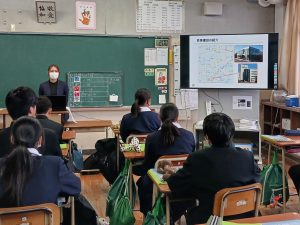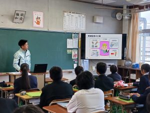 11月18日に倉敷市立北中学校で行われた倉敷市キャリア教育推進事業「企業学び楽舎」に参加し、授業を行いました。当日は、倉敷市内の7つの企業が、1年生に授業を行いました。