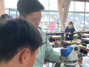 その後、現場で測量の時に使用するレベルの操作体験を全員にしてもらいました。読み取った数値が人によりバラバラで、操作の難しさを実感してもらえたのではないでしょうか?