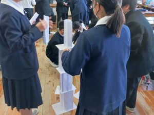 最後は、ペーパータワーゲームをしてもらいました。A4のコピー用紙30枚のみを使用して、のりやテープ、はさみなどは一切使わず、一番高いタワーを作ったチームの勝ちというルールでゲームを行いました。同じ数量の材料を使用して、同じ時間内に、チーム内でアイデアを出し合い、役割分担をして作業を進めるという体験をしてもらうこと通じて、現場監督という仕事を少しでも実感してもらえたらと思い、実施しました。皆さん、大盛り上がりで楽しんでタワーを作っていました。